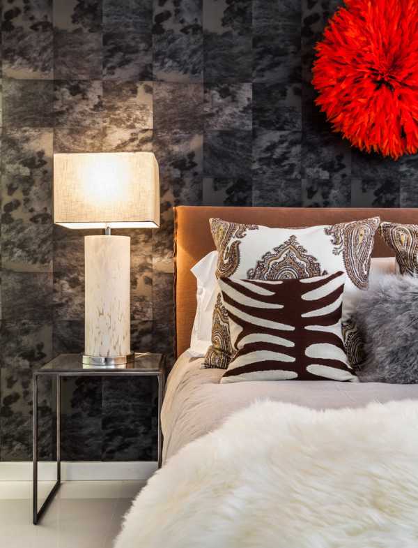 Слоистая текстура (овчина, зебра-печать и лохматый материал) добавляет в пространство теплоту и гармонию, а светильники, что стоят по обе стороны постели, – симметрию.