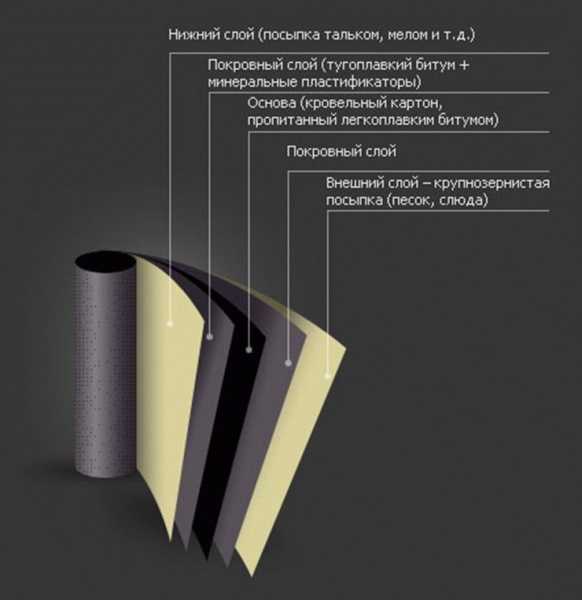 Что касается состава, то он прост. Как основа используется кровельный картон. В процессе изготовления его пропитывают нефтяным битумом, после чего с обеих сторон наносят тугоплавкий битум. Сверху находится слой защитной и декоративной присыпки. Она защищает рубероид от УФ лучей, от механических повреждений и повышает стойкость к влаге. Да и в рулоне покрытие не склеивается друг с другом.