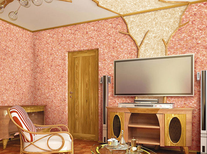 С помощью жидких обоев можно создать в гостиной индивидуальный интерьер. Данный материал помогает визуально расширять в комнате пространство, он идеален для декорирования стен.