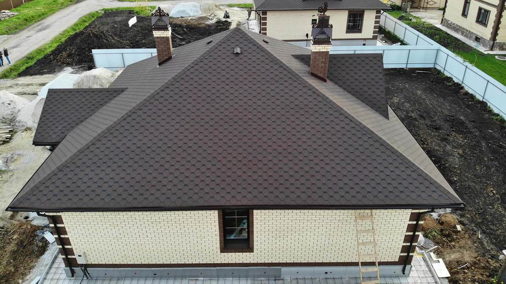 Асфальтовая черепица на шатровой крыше с двускатными слуховыми окнами на жилом домеPREMIUM