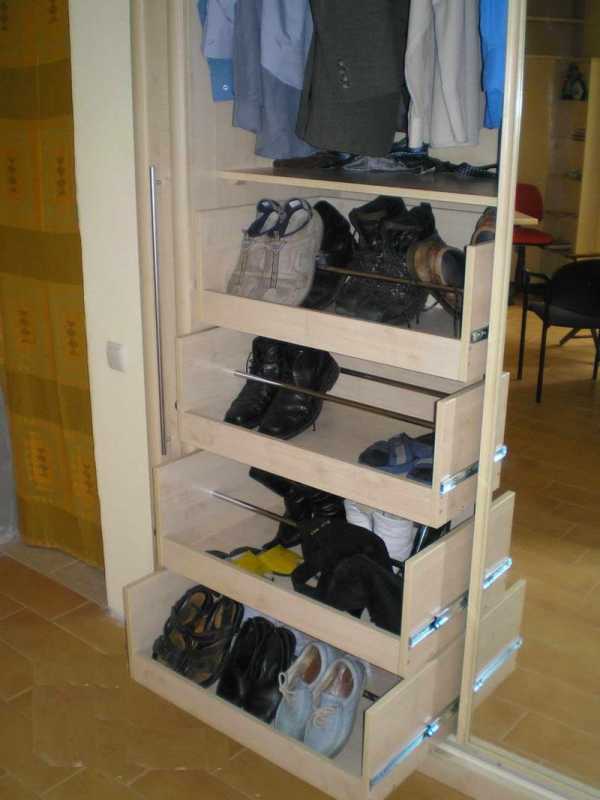 - в коридоре важно рационально организовать хранение обуви. Если места не достаточно, не стоит подбирать для узкого пространства обувницу. Ее функцию выполнит вместительная широкая полка в самом низу шкафа. Она должна быть в ширину не менее 26 см, так как стандартный размер мужской ноги это 26-28 см;