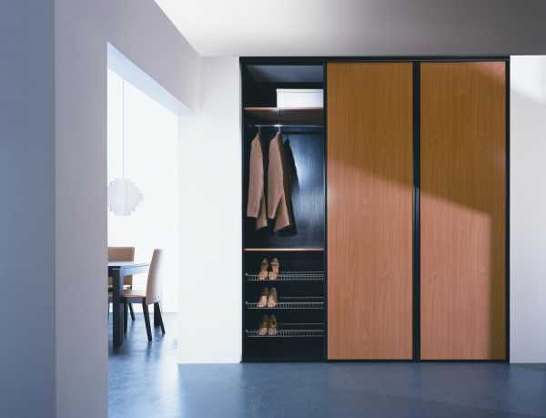 - наличие раздвижных дверей — эта особенность позволяет вместить в узкий коридор довольно большое по размеру изделие с прекрасной вместительностью. Не потребуется выделять больше пространства, как в случае распашных дверок. Двухстворчатый купе не отнимет у коридора площадь;