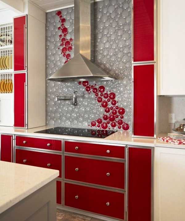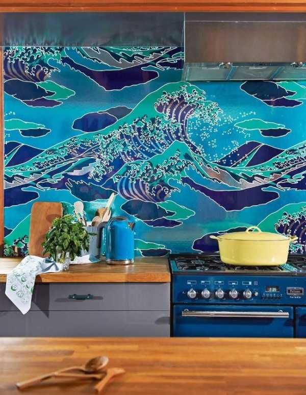 Можно нанести изображении ручной росписью это будет смотреться изящно, и притягивать взоры гостей. Если Ваша кухня уже оклеена яркими и выразительными обоями, то декор вовсе и не нужен. Хотя можно установить декоративный элемент из прозрачного стекла. Он послужит не только украшением, но и защитит фартук на кухне от повреждений.