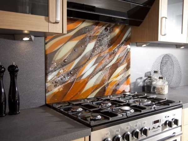 Скинали из стекла для кухни. Это обычный толстый материал. Рисунок наклеивают на тыльную сторону поверхности. Материал дает возможность наносить рисунок с помощью красок.
