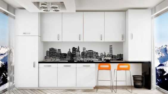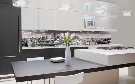 Необычными скинали получаются если использовать фотопечать при помощи, которой они наносятся на поверхность и таким образом помещение зрительно увеличивается и выделяется общая идея всей кухни.