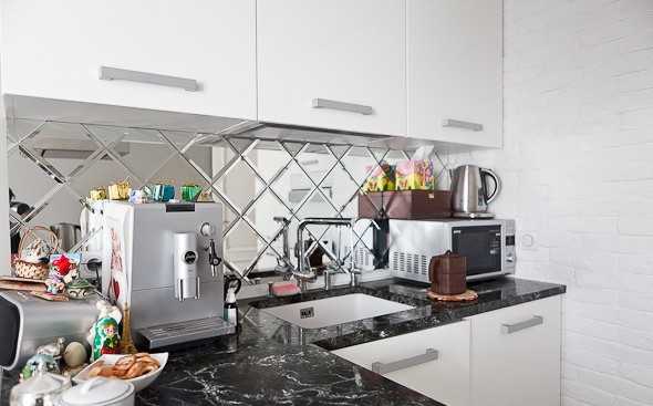 - Будут иметь зеркальное покрытие. Для маленькой кухни фартук-зеркало станет отличным вариантом. Он визуально расширит помещение.