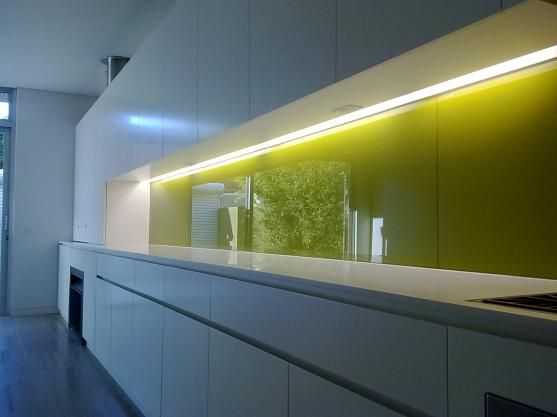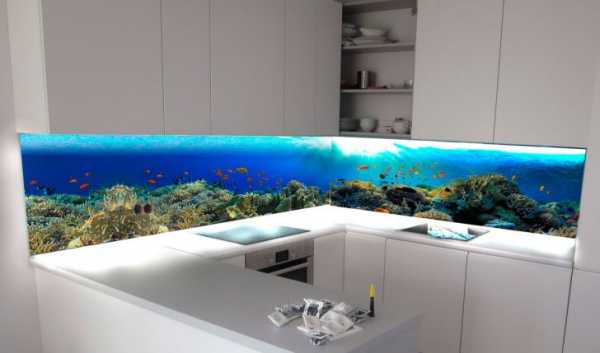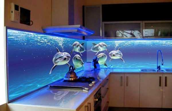 Кухонный фартук, обустроенный подсветкой, станет центральным элементом декора в вечернее время. Подсвечивать лучше стекло, изображение на которое наносилось не УФ-печатью, а латексными чернилами. Они и по цвету ярче, и для здоровья безопаснее.