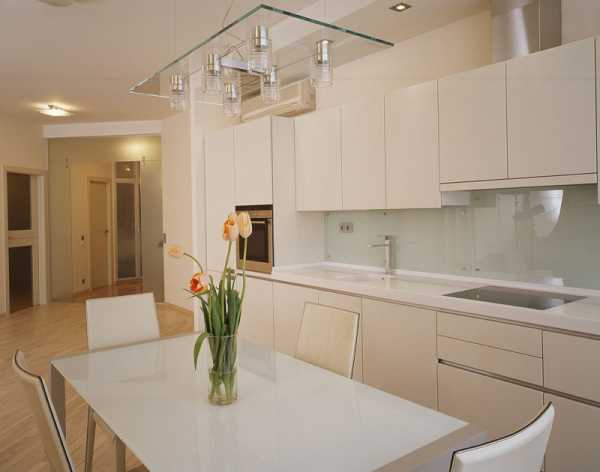 Стеклянные панели просто адаптировать с окружающим интерьером. Для этого достаточно ввести в него несколько зеркальных вставок или меблировать кухню стеклянным столом.
