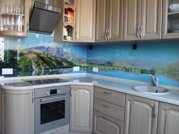 Реалистичный пейзаж на скиналиВыбор дизайна фотопечати должен основываться на базовых цветах кухни. Классические белые скинали с рисунком в виде крупных фруктов, ягод, чашек кофе идеально смотрятся в интерьере в стиле модерн и подойдут для маленькой кухни. А вот черно-белые изображения городов, экзотические цветы и стилизации подойдут для большого пространства и хорошо сочетаются со светлой и яркой мебелью. Есть еще несколько способов нанесения рисунка на стекло.