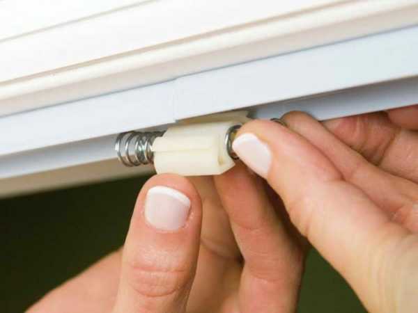 Перед установкой на профиль крепят защёлку. Она должна находиться на той стороне проёма, от которой будут двигаться ламели. В защёлку заводится ось торцевой панели.