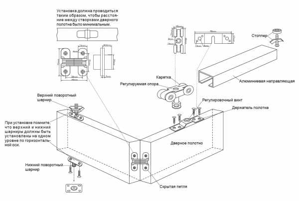 | Повышенные требования к качеству проведения монтажа направляющих – незначительные, даже малейшие перекосы, несоответствие осей расположения вызовет заедание, стопорение и заклинивание дверей |
