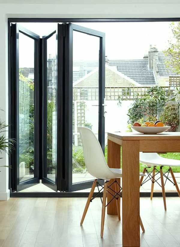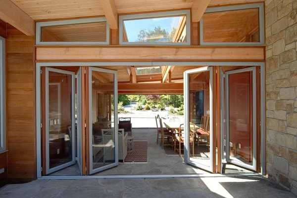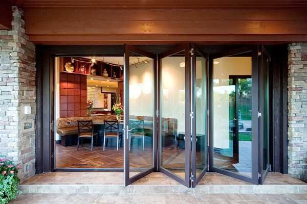 На заметку! В загородных домах, где двери-гармошка могут использоваться как альтернатива внешней стене, отделяющей, например, веранду от гостиной, устанавливают металлопластиковые системы с большой площадью остекления.