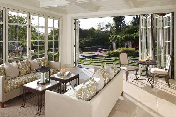 Стеклянная складная перегородка между гостиной и террасой