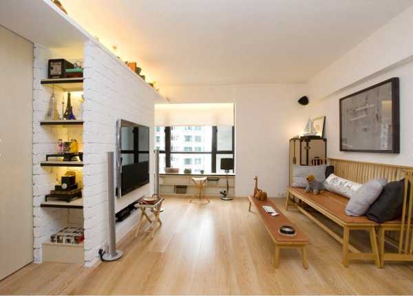 На фото белый кирпич в интерьере гостиной комнаты. Проект: «Дизайн двухкомнатной хрущевки 45 кв. м.»