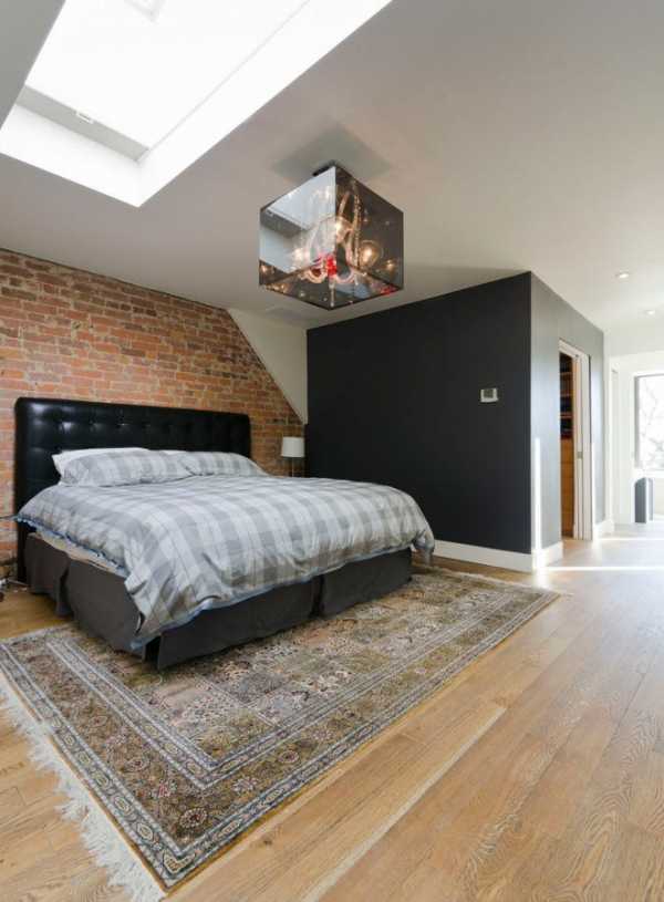 Идея с выкладкой стены из кирпича нашла свое применение и в спальной комнате.