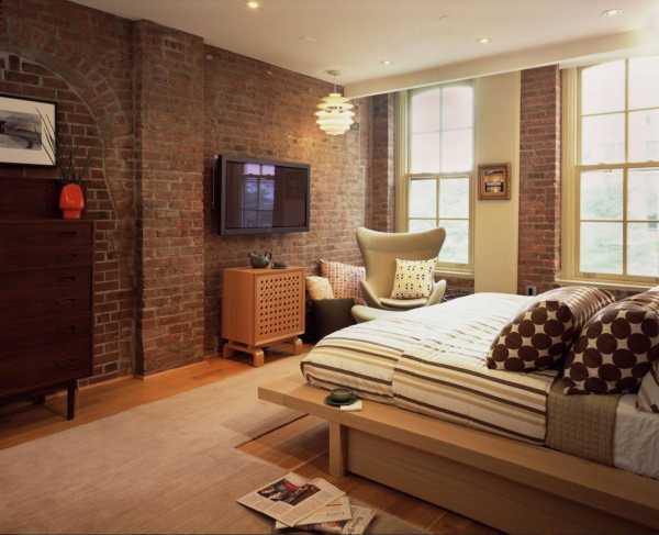 Спальне в стиле лофт отлично подходит кирпичная стена с нейтральным оттенком