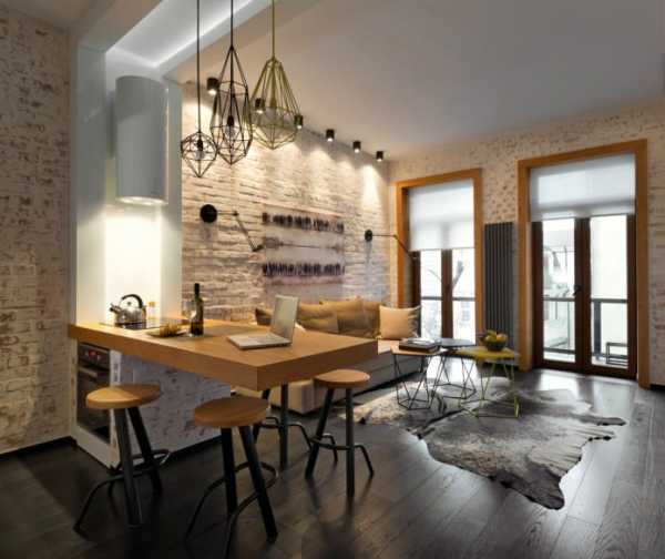 На фото барная стойка, декорированная красным кирпичом. Проект от Litvinov design «Стиль лофт в интерьере компактной студии».