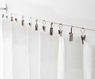 Для того, чтобы закрепить полотно шторы на струне, используют специальные крючки, клипсы или зажимы.