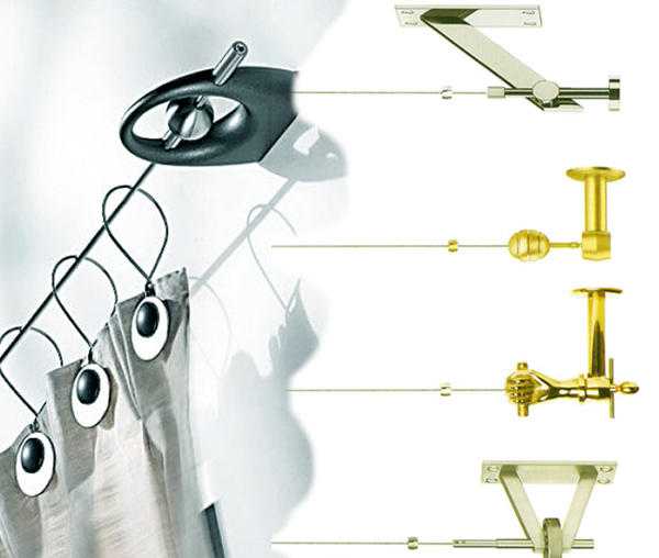 Главный элемент этого карниза – это натянутая струна для штор из очень крепкой стали. Крепится она с помощью специальных устройств – кронштейнов.