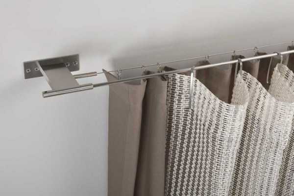Конструкция этого карниза очень проста. Основной элемент – струна (иногда две или три). Ее диаметр составляет несколько миллиметров, а вот длина бывает разной. Если она более 3 м, то требуется установка дополнительного кронштейна посередине, так как даже очень прочная, но слишком длинная струна имеет тенденцию со временем прогибаться. При продумывании дизайна и вывешивании штор стоит учитывать, что срединный кронштейн не позволит двигать полотна от одного края карниза к другому.