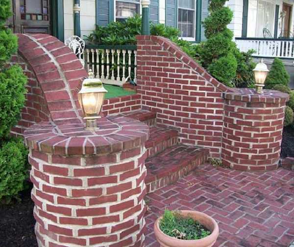 Красный кирпич или шлакоблок можно покрыть недорогой тротуарной плиткой. Очень симпатично выглядит круглая лестница крыльца из красного кирпича, уложенного на белом цементе, фото. Особенно если стены дома выполнены в том же стиле.