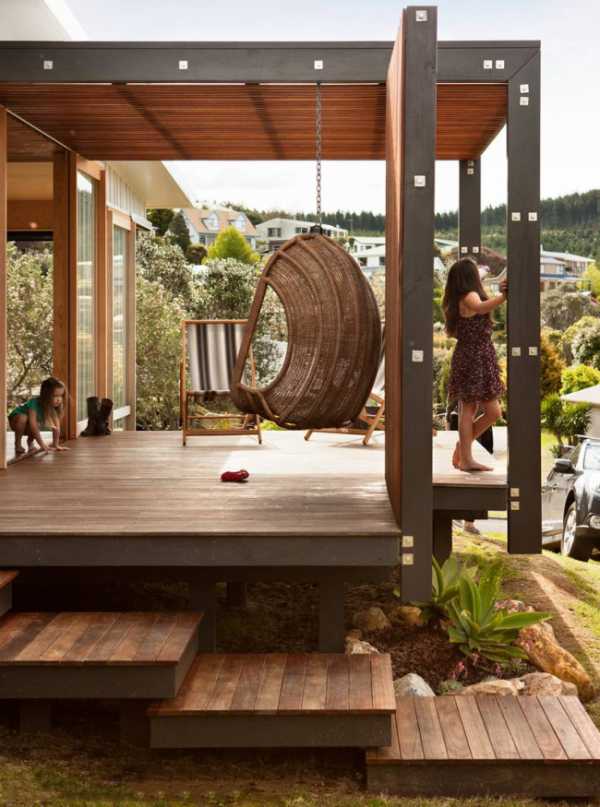 Наиболее органичным вариантом для крыльца загородного дома будет металлическая лестница с деревянными ступенями, но если дом из кирпича или бетона, то и полностью металлический каркас со ступенями из рифленого металлопроката будет смотреться неплохо, особенно если украшен он коваными деталями. Ступени лучше всего оформлять наиболее износоустойчивым материалом, таким как, например, декоративный камень или оставлять их металлическими.