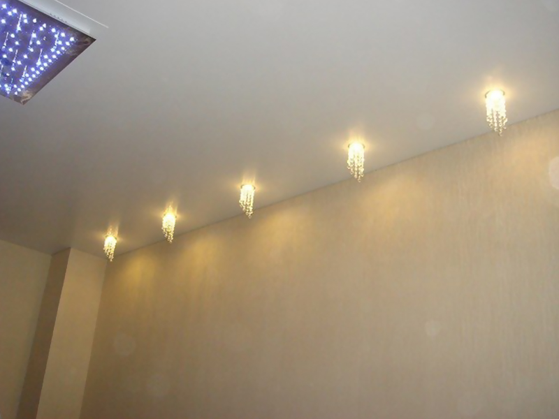 Фото вариантов установкиСоздать яркое, качественное освещение в любом помещении помогут точечные светильники для натяжных потолков. Фото, представленные ниже, демонстрируют различные варианты установки таких элементов, из которых можно выбрать наиболее подходящий для конкретного помещения. Правильный выбор и установка светильников возможна только при наличии определенных знаний. Необходимо ознакомиться с существующими типами источников света и правилами их установки.