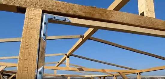 Устанавливаем фермы на каркас, равняем заподлицо с каркасом, фиксируем на оцинкованные уголки. Сверху делаем конек.
