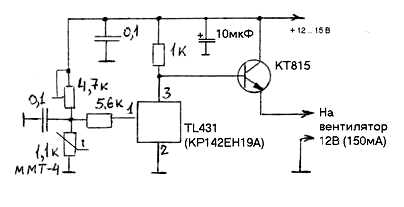Термодатчик реагирует на повышение градусов, за счет чего срабатывает вся схема, и вентилятор включается.