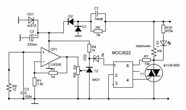 При включении терморегулятора в сеть необходимо соблюдать полярность, минус регулятора должен быть на нулевом проводе, иначе фазное напряжение появится на корпусе паяльника, через провода термопары. Регулировка диапазона производится резистором R3. Данная схема обеспечит долгую работу паяльника, исключит его перегрев и увеличит качество пайки.