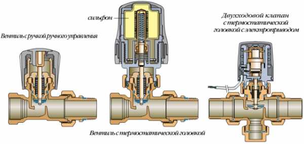 - Термостатический вентиль с исполнительным механизмом перекрывания потока теплоносителя.