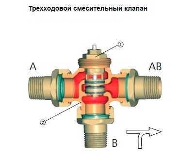 - Смесительный, который имеет один выход и два входа. Изделие работает по такой же схеме как трехходовой кран. Основное назначение – это смешивание подачи горячей воды с обраткой, для получения требуемой его температуры;