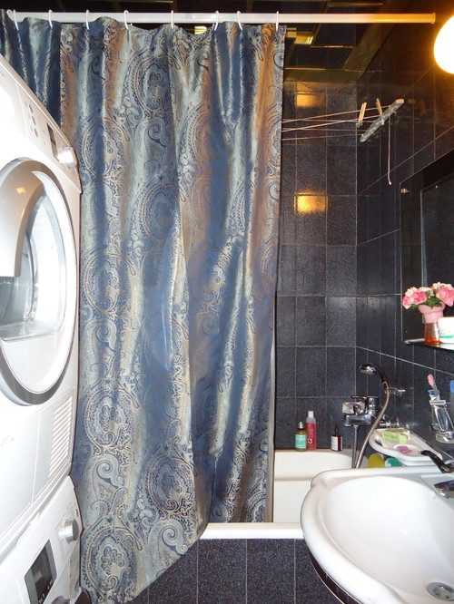 Приём: Этот санузел стал домашней прачечной. Несмотря на скромные размеры помещения, именно здесь нашлось место для компактной стиральной машины.