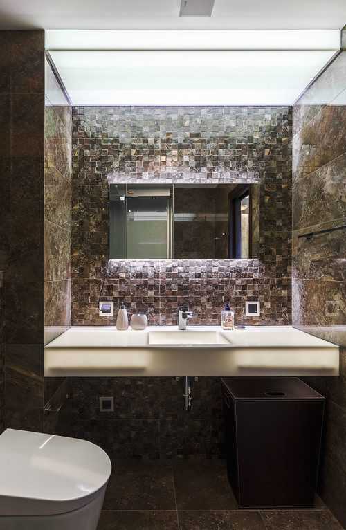 Приём: Столешница с интегрированной раковиной выполнена из светопроницаемого искусственного камня со встроенной подсветкой. Потолочный элемент над раковиной сделан по похожему принципу: вместе они дают приятное мягкое освещение и эффект глубины пространства.