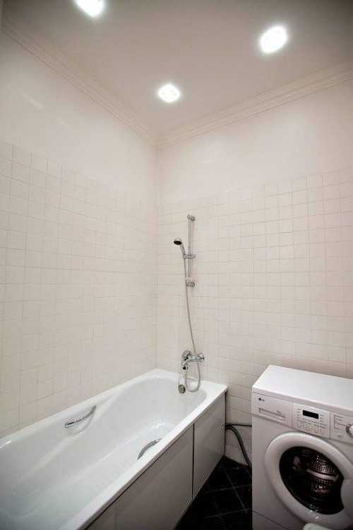 - Яркое освещение. Даже высокую и просторную комнату можно визуально превратить в тесную коморку, если осветить ее маленькими и тусклыми лампочками. Правильно подобранное и установленное освещение, позволит зрительно увеличить восприятие совмещенной ванной в малогабаритной квартире. Фото ванных комнат после усовершенствования освещения наглядно свидетельствуют о правильности такого решения. Желательно использовать несколько мощных ламп, которые обеспечат яркое и равномерное освещение всего объема помещения.