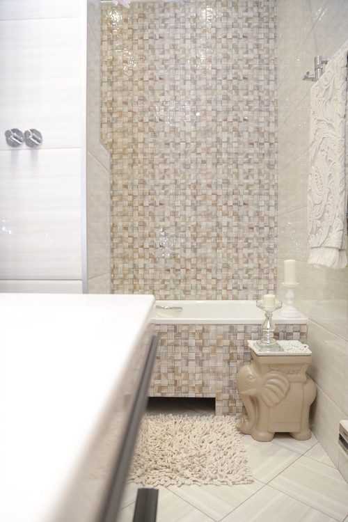 Радужная светлая плитка, схема укладки которой выгодно отличается от традиционной, что видно по фотографии. На дальней стенке плитка положена вертикально, по бокам – горизонтально, а вот на полу – по типу ромбического рисунка. Тем самым, несмотря на одинаковый цвет плитки, уложенной в нижней части помещения создается ощущение красоты и гармонии.