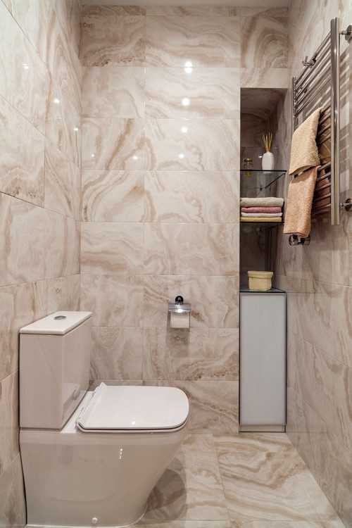 Мраморная отделка всегда придает любому помещению статус аристократичности, причем туалетная комната здесь не является исключением. На фото лучшим образом показан пример такой отделки, где выгодно сочетаются светло бежевый и фиолетовый цвета, на фоне которых белый унитаз выглядит очень хорошо.