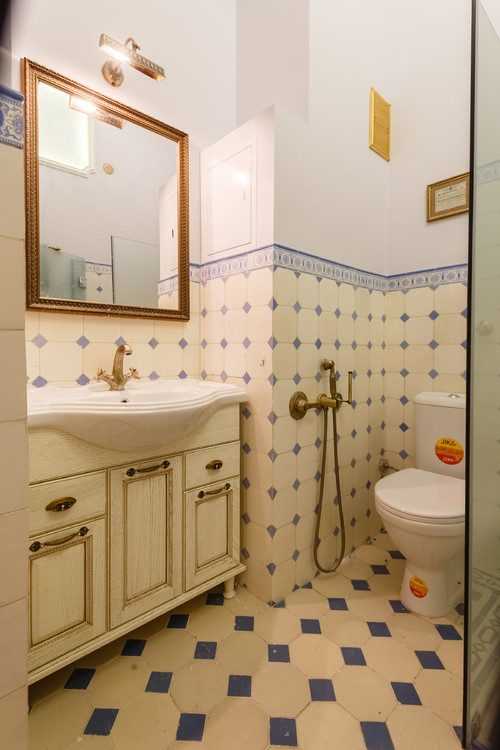 Приём: Гостевая ванная комната была отделана антикварной керамической плиткой начала XX века от фабрики «Дзевульский и Ланге». Её бережно сняли со стен главной ванной, отреставрировали и перенесли в гостевой санузел с меньшей площадью облицовки: дело в том, что половина плитки оказалась утрачена в период коммунального заселения квартиры.