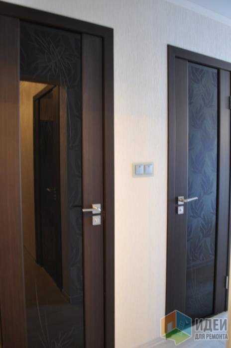 Двери венге, снаружи – черное стекло, внутри – в туалете так же черное стекло, а в ванной – зеркало.