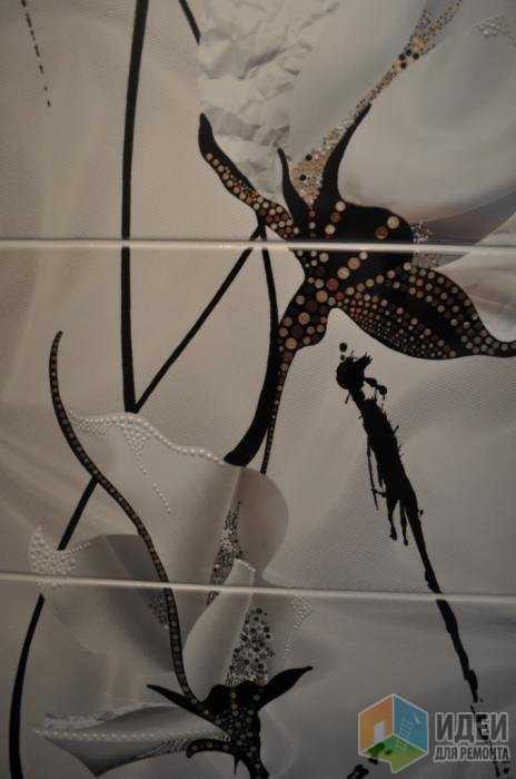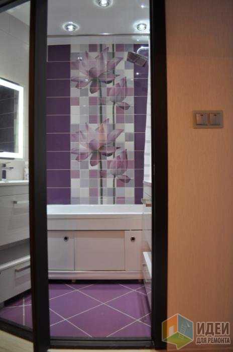 Размер плитки был удобен нам еще в том плане, что на каждую стену требовалось ровно 3 плитки – то есть минимум подрезки. Плитка глянцевая, фиолетовая – malvа, светлая – rosa – в магазине она выглядела розоватой, на деле же она реально практически белая оказалась. Панно состоит из квадратиков, каждый с орнаментом, рисунком, кое-где зеркальным – очень интересно смотрится вблизи. Так как помещение маленькое, раскладку сделали простую, и плитка везде кроме стены напротив двери – светлая. Ухода плитка за собой не требует никакого – хотя встречала отзывы, что глянец придется натирать постоянно – ничего подобного!
