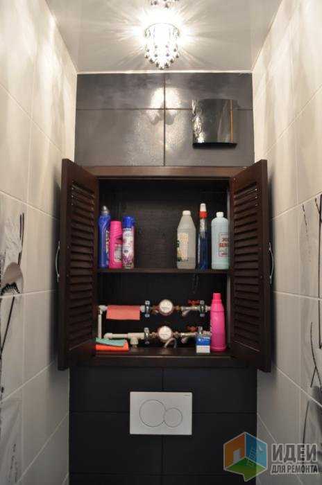 Так же сделали самопальный шкафчик для хоз. принадлежностей благодаря установке инсталляции – дверцы из Леруа, выкрашены на много-много раз морилкой цвета «палисандр», внутри шкаф тоже покрасили этой же морилкой. Очень удобно – и доступ к счетчикам есть, и много места для хранения.