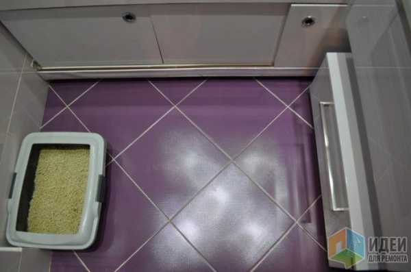 Кошачий горшок — для двоих, не стала убирать для красивых фото – стоит он всегда здесь, что поделать, не на кухне же его размещать) Сначала мечтали сделать дверцу в двери для живности, но в стекле такую не установить, поэтому дверь в ванную держим приоткрытой, либо открытой – а т.к. в других комнатах – в гостиной, кухне так же присутствуют сиреневые оттенки, ванная прекрасно с ними сочетается.