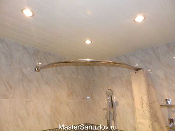 Простота далеко не всегда свидетельствует об отсутствии вкуса, о чем лучшим образом скажет данный тип отделки ванной комнаты. Здесь мы видим душевую кабину, которая выполнена в виде обычной хромированной трубы, а также красивой шторки, задвигающаяся на специальных кольцах. Потолок оформлен в виде ПВХ панелей со встроенными светодиодными светильниками.