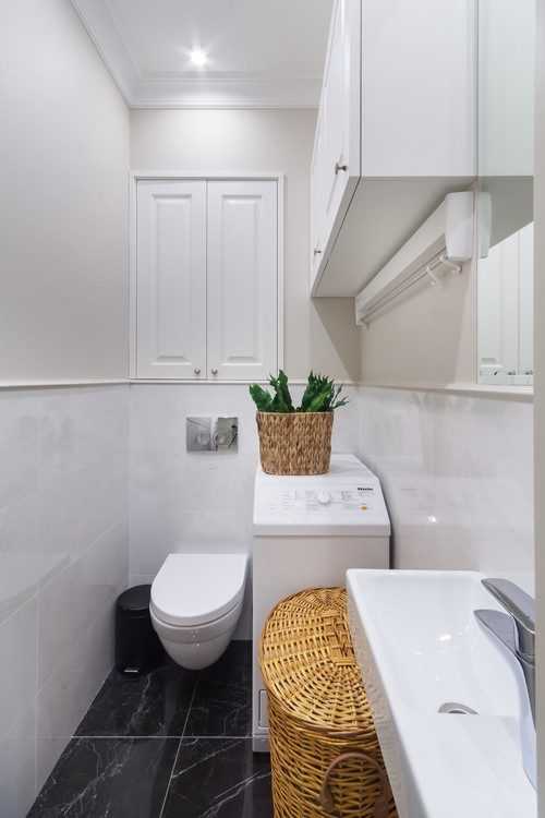 Авторы проекта изменили цветовую гамму, чтобы приблизить отделку санузла к общей концепции, сделали ставку на монохромную палитру. Кроме небольшой раковины здесь поместился и узкий подвесной шкаф для бытовой химии и косметики.