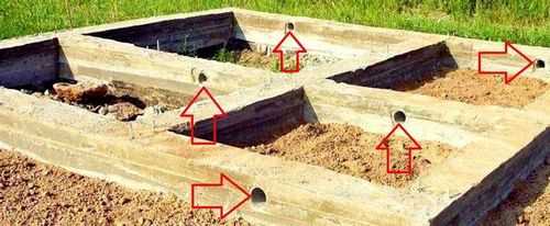 На фото отмечены каналы вентиляции фундамента в бане. Обратите внимание на то, что они создают свободный путь для поступления воздуха под все комнаты здания