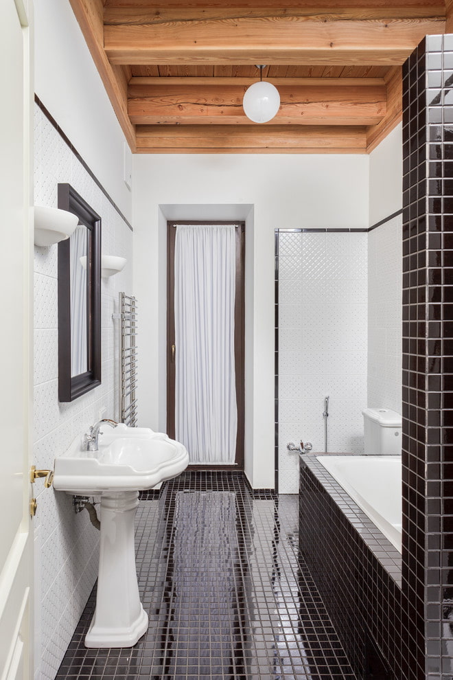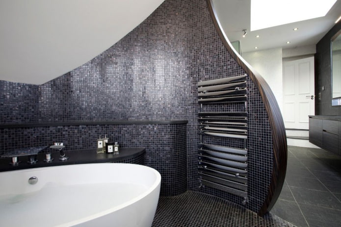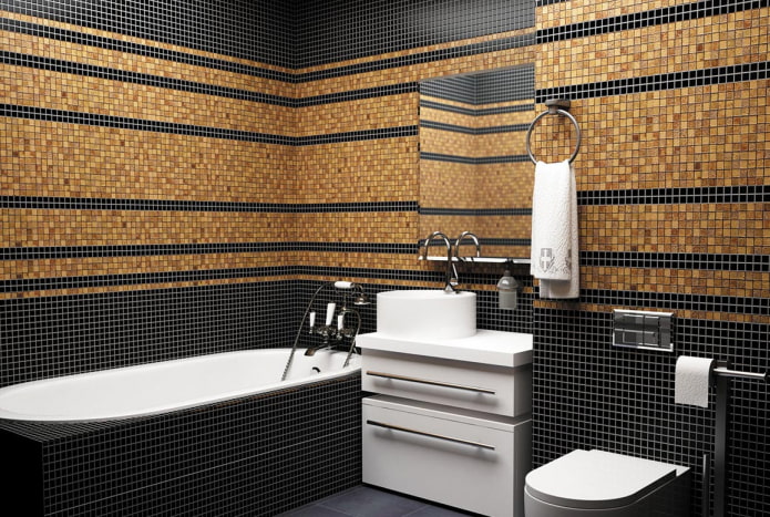 На фото стены в ванной комнате, облицованные черной мозаикой с золотистыми узорами.