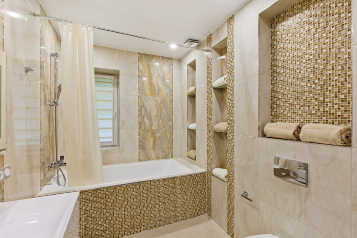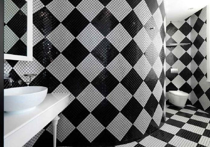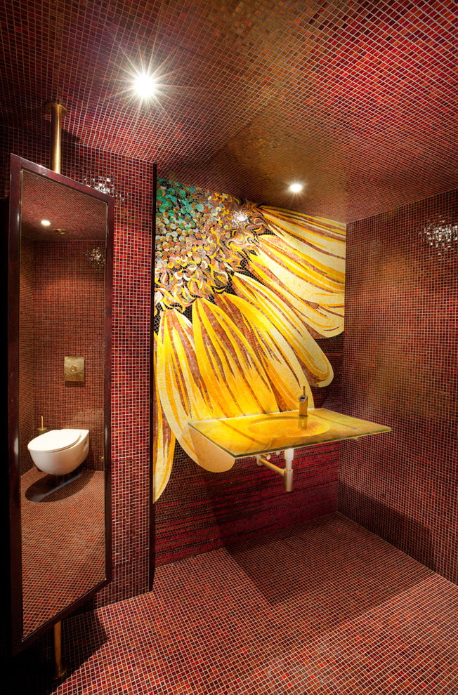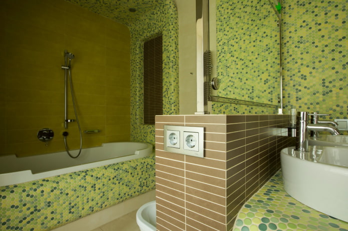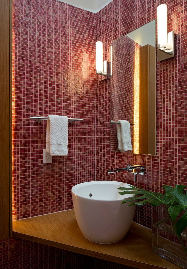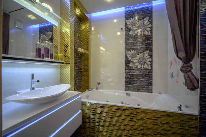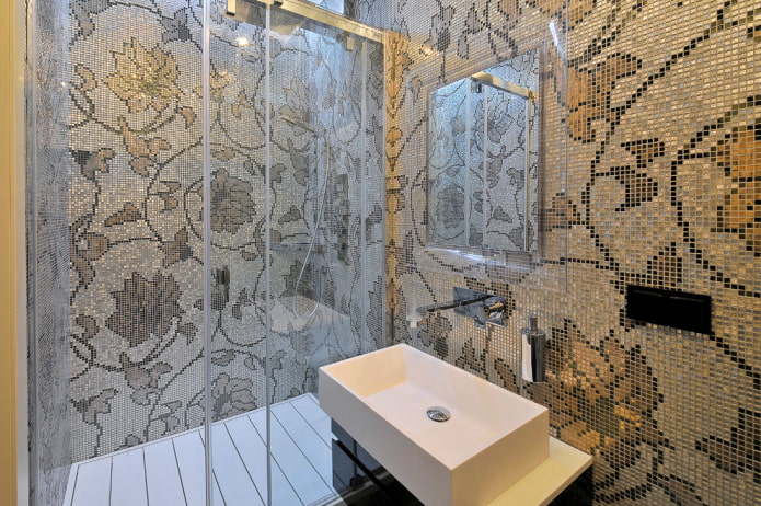 Для отделки используются самые различные виды мозаики, которая может иметь однотонное, матовое, глянцевое исполнение, представлять собой декоративные узоры или рисунки и украшать, как все стены в помещении, так и только одну.