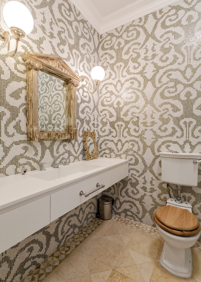 На фото мозаичные геометрические фигуры на акцентной стене в интерьере туалета.