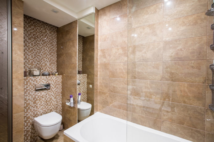 На фото интерьер ванной комнаты со стеклянной мозаикой коричневого цвета на стенах.