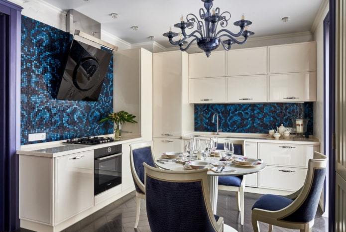 На фото мозаичная плитка с узорами в оформлении рабочей зоны в интерьере кухни.